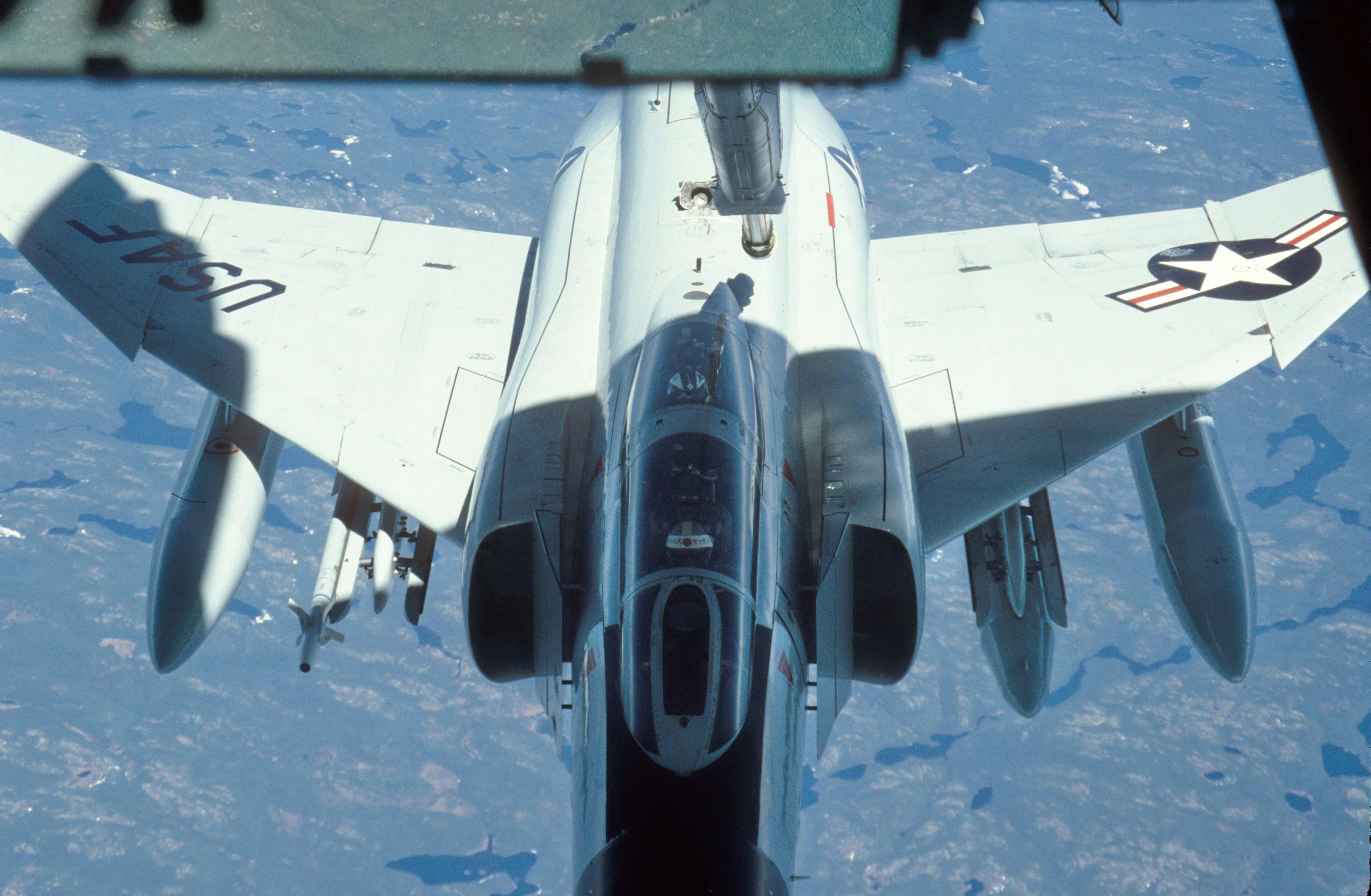 | At the end of May in 1985 we went to a big Low Level excercise in Goose bay, Labrador. We went along with a KC-10 that took our six F-4s all the way. It was a 6.2 hr. day. My back was seriously killing me by the time we got there. The weather was marginal when we got there so we each had to get flight breakups and shoot an individual ILS. I had an extra camera that I gave to someone - I don't remember who - but that's me. | I got to fly one of the planes on the way out to Goose Bay. Since I knew it would be a long day and we would be with a tanker (didn't have to worry about radios) I asked the one of the guys in the Comm shop to make me an adapter so I could hook up my Walkman and listen to some music tapes on the way. My WSO was Jim Killian and we rocked out to some good tunes all the way. (Van Morrison, Eric Clapton...) The musical adapter makes another appearance in the Viper, later on in the story. That's me out on the end. | Cruising along with music in my heart :) |